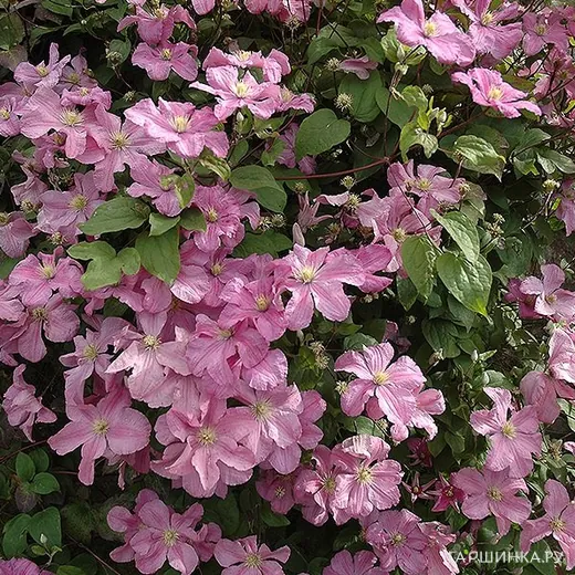 Клематис Комтесс де Бушо (Графиня Бушо) крупноцветковый (3) - Цветет чистым, прозрачным розовым цветом. Цветы состоят из 6 лепестков и имеют диаметр от 12 до 14 см. Длинные декоративные тычинки бледно-желтые. Цветет обильно и продолжительно, с июня по август. Высота растения 300-400 см. Зона зимостойкости: 4 (-35 ° С).