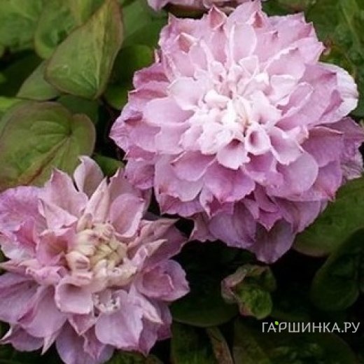 Клематис Дэнсинг Смайл Зодасми крупноцветковый (2)- светло-фиолетово-розовые махровые цветки. Цветение обильное. Особенно выигрышно смотрится при посадке на темном фоне. Цветет в мае-июне, августе-сентябре. Высота 2-3 метра. Диаметр цветка 14-18 см. Зона зимостойкости: 4 (-35 ° С).