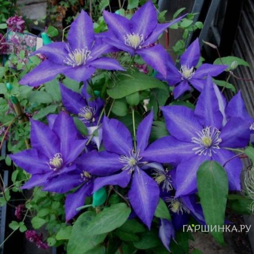 Клематис Даниэль Деронда крупноцветковый (2) - Бельгийский сорт клематиса с крупными цветами, до 15-18 см. в диаметре. Цветок или полумахровый, или одиночный, сине-фиолетового цвета. Пыльники светло-желтые, с салатовым оттенком. Цветение обильное. Цветет в мае-июне, августе-сентябре. Высота до 250см. Диаметр цветка 14-18 см.