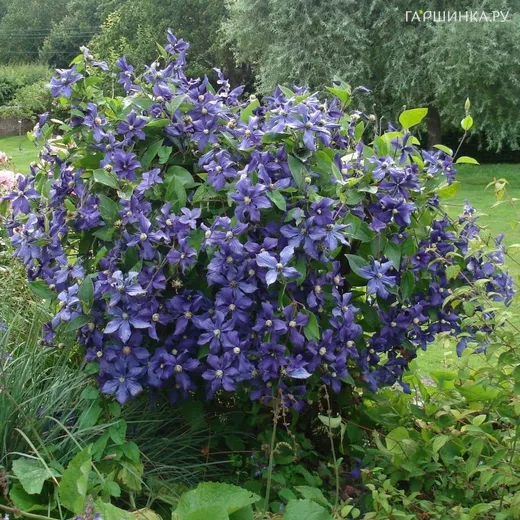 Клематис Дюрана цельнолистный (3) - один из самых старинных сортов. Цветки изначально колокольчиковидные, после распускания плоские, яркого сине-фиолетового цвета, с фиолетово-белыми тычинками и желтыми пыльниками. Цветение продолжительное, с июня до заморозков. Без опоры стелется по земле и может выращиваться как почвопокровное растение.