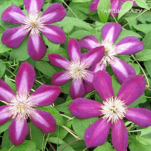 Клематис Файрфлай (2) - Большие пурпурные цветки с полосой более яркого розового цвета, проходящей по центру лепестка. Высота До 3 м. Обрезка на зиму до 75 см. Диаметр цветка 8-10 см. Цветение в июне на побегах прошлого года и в августе-сентябре на побегах текущего года.