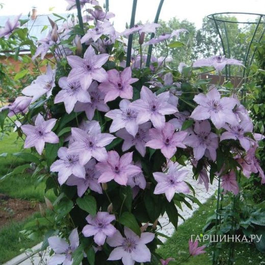 Клематис Хегли Хайбрид крупноцветковый (3) - Сорт высотой до 250 см. Цветки сиренево-розовые с перламутровым оттенком. Пыльники пурпурно-бордовые. Диаметр цветов до 15 см. Цветет обильно и продолжительно, с июня по сентябрь. Зона зимостойкости: 4 (-35 ° С).