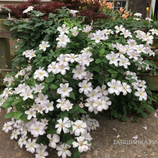 - Крупные жемчужно-белые цветки с жёлтыми тычинками.