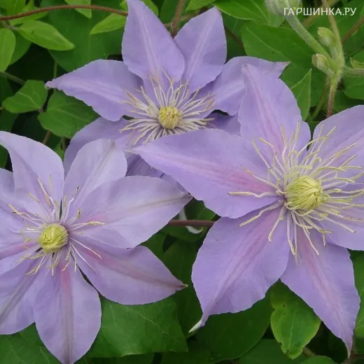 Клематис Юста крупноцветковый (3) - компактный сорт высотой 1,0-1,5 метра. Цветки диаметром 6-8 см с овальными, волнистыми по краям лепестками. Окраска светлая голубовато-розовая. Пыльники желтые. Цветение позднее в июле и сентябре. Отличный вариант для выращивания в контейнерах. Зона зимостойкости: 4 (-35 ° С).