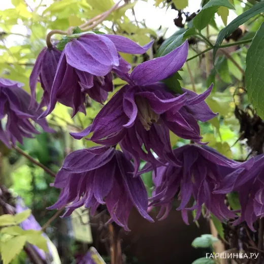 Клематис (Княжик) Люминос Даск (1) - Цветки махровые, диаметром 7-9 см, колокольчатые, широко открытые, с нежным лимонным ароматом, состоят из 4 широких чашелистиков и до 15 длинных, слегка волнистых стаминодий. Лепестки розово-фиолетовые. Цветение в мае. С июня до осени куст украшают причудливые пушистые семенные головки. Листья декоративные, золотисто-жёлтые, состоят из 3-5 листочков. Лиана высотой 200-300 см. За опоры цепляется листовыми черешками. Сорт морозостоек и неприхотлив. Не любит жарких мест. Переносит полутень. Особенно пригоден для выращивания у невысоких заборов, камней, старых пней, лиственных и хвойных кустарников. Может использоваться как почвопокровное растение. Зона 4 (до -29ºС).