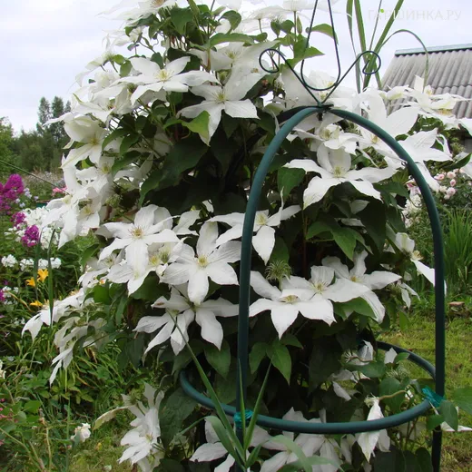 Клематис Роко-Кола крупноцветковый (3) - цветки кремово-белые с жёлто-зеленоватой полоской посередине лепестка. Цветение очень обильное. Компактный. Может карабкаться по лиственным или хвойным деревьям. Подходит для выращивани я в контейнерах.