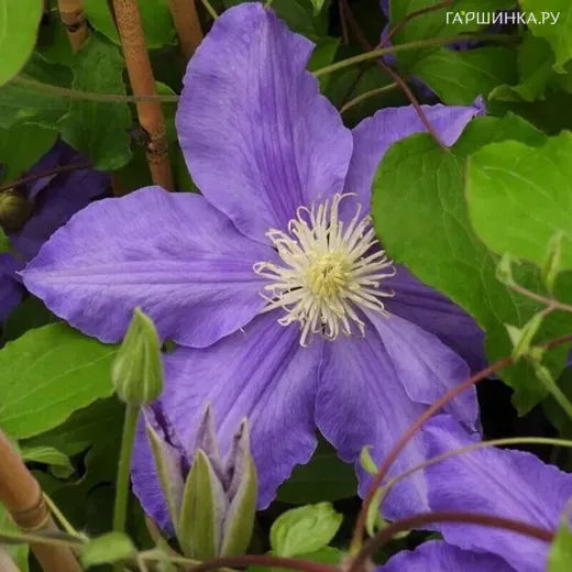 Клематис Лазурштерн крупноцветковый (2) - одна из самых красивых лиан, которая может играть роль почвопокровного растения при отсутствии опоры. Высота растения достигает 2,5-3,5 м и даже 4 м в некоторых случаях. Диаметр куста составляет около 1,5 м. Листья тройчатые и имеют заостренную форму с цельными краями. Интенсивный зеленый цвет листьев сохраняется как летом, так и осенью. Цветки Лазурштерн напоминают звезду – яркую и эффектную. Они крупные (22 см в диаметре), остроконечные и имеют волнистые края. Окраска цветков лавандово-голубая со светло-желтыми тычинками.