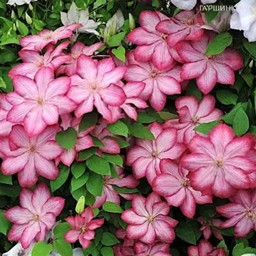 - Немахровые розово-белые цветки с красной полоской по центру.