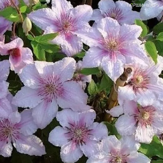Клематис Мармори крупноцветковый (3) - группа обрезки сильная (3), плети 3,5, метра, легко направляются. Цветки немахровые , светло-розовые, слегка волнистые, 14 см, чашелистики заостренные, нити у тычинок светлые, пыльники красно-коричневые. Цветет только на текущих побегах, обильно и продолжительно. Зона зимостойкости 4.