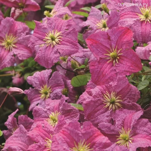Клематис Мазурек (3) - сильно растущее растение, с июня до августа интенсивно цветёт розовыми очаровательными цветками. Пригодно для выращивания в контейнерах. Цветки средней величины, почти круглые, открытые, направленные по бокам и вверх, состоят из 4 широких в виде эллипса розовых чашелистиков с ярко выраженной широкой полоской по середине. Красивые, волнистые края и загнутые верхушки. Тычинки короткие (около 1 см) с жёлтыми пыльниками на зелёных нитях окружают пучком светло розовых столбиков.