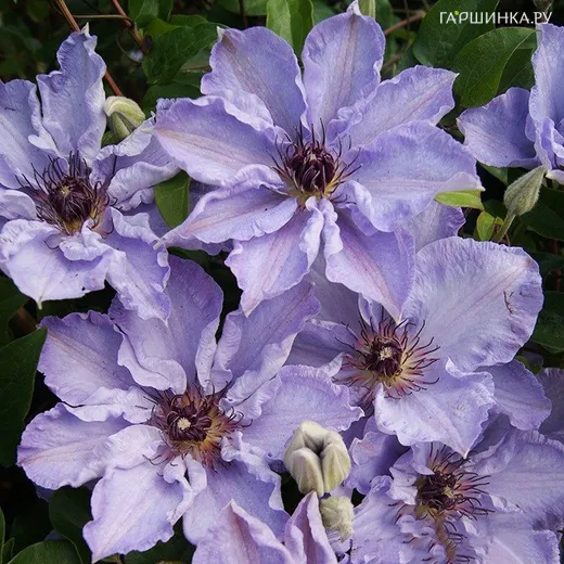 Клематис Миосотис крупноцветковый (2) - плети 2 метра, легко направляются. Цветки немахровые, фиолетово-синие, лепестки волнистые, чуть светлее к середине, 12 см, чашелистики заостренные, нити у тычинок светлые, пыльники темно - красные, пурпурные. Цветет на прошлогодних и текущих побегах, обильно и продолжительно. Зона зимостойкости 4.