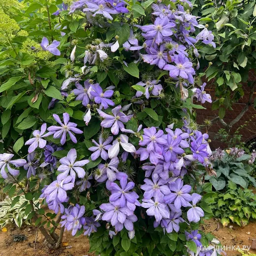Клематис Миссис Чолмондели крупноцветковый (2) - Цветки крупные, светло-лавандово-голубые с лиловым оттенком, на побегах прошлого года полумахровые, тычинки светло-коричневые. Цветение обильное. При слабой обрезке цветёт почти беспрерывно с мая по август. Высота 300-400 см. Диаметр цветка до 23 см. Зона зимостойкости: 4 (-35 ° С).