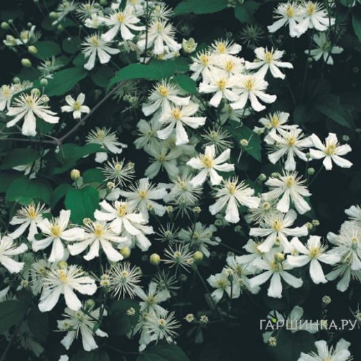Клематис Поль Фаргез (3) - быстрорастущий, обильноцветущий, неприхотливый сорт. Отличается звездообразными, маленькими, белыми цветками, которыми просто усыпано растение, словно первым снегом. Пыльники желтые. Цветет долго, с июля по август. Высота растений: 500-700 см. Размер цветка: 4 см. Цепляется за опоры листовыми черешками. Прекрасно растет и на садовом участке, у стен, беседок, решеток и ограждений.