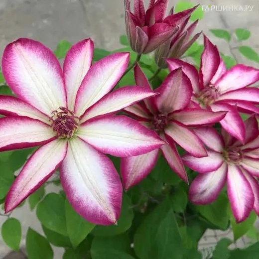 Клематис Пикоти крупноцветковый (2) - группа обрезки слабая (2), плети 3,0 метра, легко направляются. Цветки немахровые белые, лепестки волнистые, край темно-пурпурный, 14 см, чашелистики заостренные, нити у тычинок светлые, пыльники бежевые, пурпурные. Цветет на прошлогодних и текущих побегах, обильно и продолжительно. Зона зимостойкости 4.