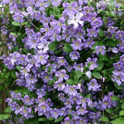 Клематис Принц Чарльз крупноцветковый (3) - компактный сорт высотой 1,0-1,5 метра. Отличается небольшими цветами, до 8-10 см. в диаметре, светло-голубого цвета с фиолетовым оттенком. Лепестки эллиптической формы, заостренные. Пыльники светло-желтого цвета. Цветет обильно и продолжительно, с июня по сентябрь. Отличный вариант для выращивания в контейнерах. Зона зимостойкости: 4 (-35 ° С).