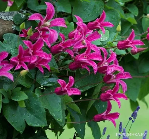 Во-первых, саженец пришел отличного качества: не пересушенный, с живыми корнями в небольшом пакете с торфом, и с наметившимся росточком. Сразу же пересадила в горшок с грунтом, слегка подрезав корни. На даче пересаживала на постоянное место, переваливая из горшка клематис уже с небольшими побегами и обеспечив ему необходимые условия для хорошего произрастания. В первый год вырос метра на полтора двумя побегами и зацвёл! А на второй год вымахал метра на три с половиной и цвёл до заморозков. Очень красивые темно-малиновые колокольчики, распускающиеся не все одномоментно, а по очереди, пока одни цветут, другие набирают бутоны. И так до заморозков. Третья группа обрезки - обрезаю полностью, прикрывю его же обрезанными побегами и корой лиственницы.