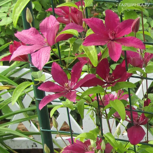 Клематис Рутель крупноцветковый (3) - группа обрезки сильная (3), плети 2,0, метра, легко направляются. Цветки немахровые , красно-свекольные, слегка волнистые, 16 см, чашелистики заостренные, нити у тычинок пурпурные, пыльники коричневые. Цветет только на текущих побегах, обильно и продолжительно. Зона зимостойкости 4.