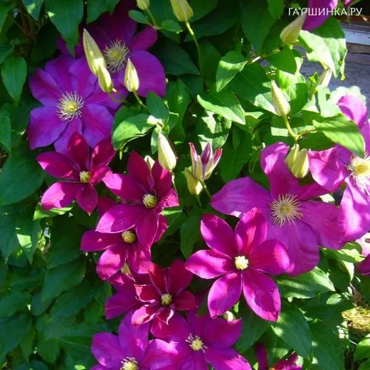 Клематис Сансет крупноцветковый (3) - высота растения 200-300 см, размер цветка 10-12 см, период цветения с мая по сентябрь, цвет красно-розовый. Яркий и эффектный представитель своего вида. Цветки этого клематиса искрящиеся, красного цвета покрыты золотистыми тычинками. Зона зимостойкости 4.