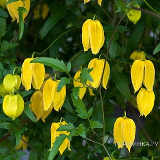 Клематис (Ломонос) тангутский (1) - Сорт с мелкими поникающими цветами и ароматом кокоса. Листья серо-зеленого цвета, продолговатые, зубчатые, на черешках. Околоцветник состоит из четырех яйцевидно-заостренных чашелистиков золотисто-желтого цвета. Тычинки светло-желтые. Диаметр цветка 4 см. Высота растения до 400 см. Зона зимостойкости 3 (- 40 С).