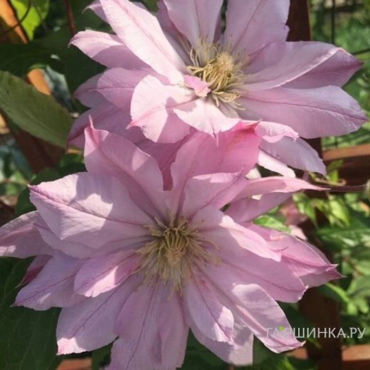 Клематис Виолет Элизабет махровый (2) - группа обрезки средняя (2), плети 2,0-3,0 метра, легко направляются. Цветки полумахровые, светло-розовые, 20 см, чашелистики заостренные, тычинки желтые, светлые. Цветет на побегах текущего и прошлого года обильно и продолжительно. Зона зимостойкости 4.