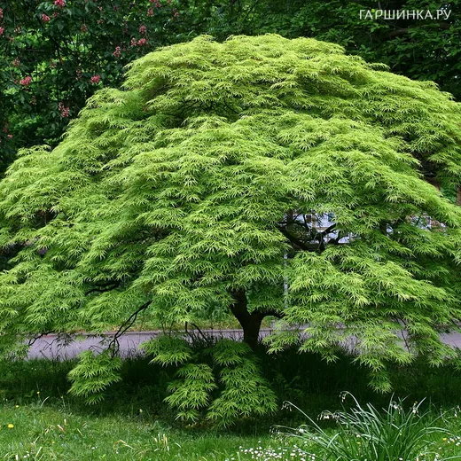 Клен веерный - декоративное, неприхотливое, медленнорастущее листопадное дерево. Высота до 6 м, молодые побеги вертикальные. Крона раскидистая, шаровидная, во взрослом возрасте - шатрообразная. Листья длиной и шириной 4-12 см, пальчатые, пяти-, семи- или девяти-лопастные. Осенью приобретают пурпурно-коричневый оттенок. Цветок мелкий, пурпурный, плод - крылатка. Проявляет значительную изменчивость.