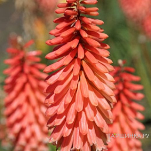 Книфофия Тимоси - экзотический многолетник, выращивание которого под силу даже неопытному садоводу. Многолетник с узкими листьями и бронзовыми стеблями, на которых лососево-оранжевые цветки. Цветет с начала лета до начала осени. Высота 90 - 120 см.