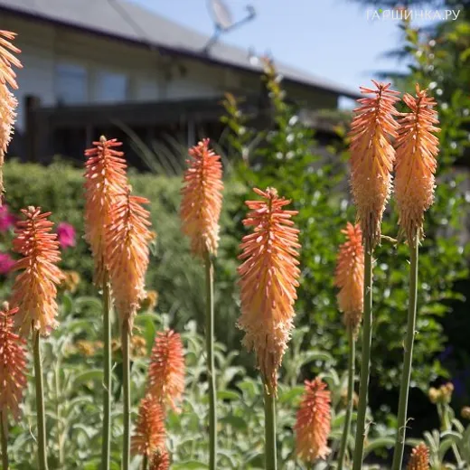 Книфофия Сафран Фогель - экзотический многолетник, выращивание которого под силу даже неопытному садоводу. Необычное растение со злаковидными листьями и соцветиями-ершиками из трубчатых цветков. Высота до 80 см, ширина до 90см. Цветки имеют нежную персиково-розовую окраску, становясь бледнее от бутона к цветку при открытии.