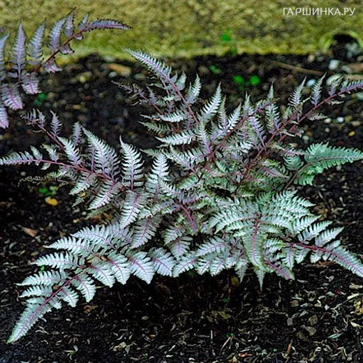 Кочедыжник (папоротник) ниппонский Бургунди Лейс – многолетнее тенелюбивое растение. Высота до 60 см. Популярный сорт с высоко декоративными красно-багряными листьями с металлическим блеском. Отличается высокорослостью и изменяющейся в течение сезона окраской. Молодые побеги этого папоротника полностью бордово-красные, но со временем светлеют и приобретают серебристый оттенок, а к осени в окраске проявляются оттенки зеленого.