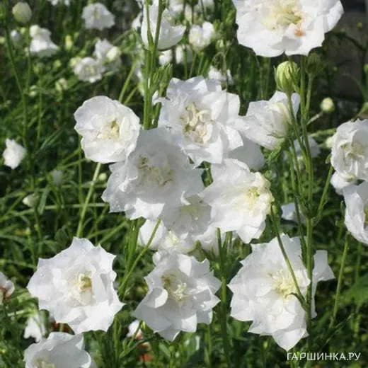 Колокольчик персиколистный Ля Бонн Ами - травянистое растение семейства Колокольчиковые. Высота: 20-40 см. Крупные махровые цветки белого цвета расположены на длинном цветоносе. Время цветения: июль-август.