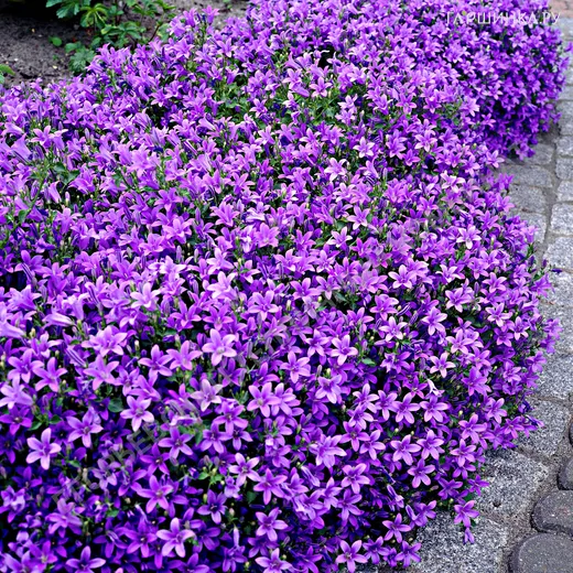 Колокольчик Портеншлага - почвопокровный, подушковидный многолетник до 20 см высотой. Разрастается до 30 см в ширину. Листья округлые, плющевидные, вечнозеленые. Цветки почти полностью раскрытые звездчатые фиолетовые или сине-фиолетовые, по 3-5 на концах стелющихся побегов. Зацветает в первой половине июня и цветет в течение месяца. Предпочитает слабокислые и нейтральные почвы. Лишь с наступлением весны старые листья уступают своё место молодой зелёной поросли. После цветения остатки соцветия нужно обрезать, это позволит улучшить внешний вид цветов и продлить период следующего цветения. Применение: используют для дизайна клумб, каменистых горок, бордюров и рокариев. Может выращиваться в декоративных контейнерах.