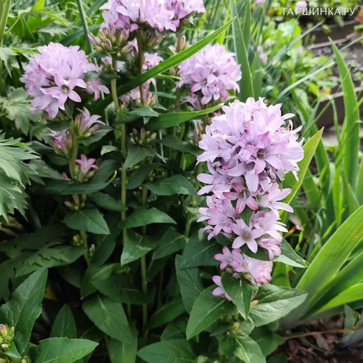 Колокольчик скученный Каролина - травянистое растение семейства Колокольчиковые. В высоту достигает 50 см. Имеет прямые, опушенные мягкими волосками, стебли и продолговатые, зубчатые, немного опушенные листья. Цветки сиренево-розового оттенка, небольшие, до 2 см. в диаметре, собраны в крупные соцветия. Цветет с июня по июль.