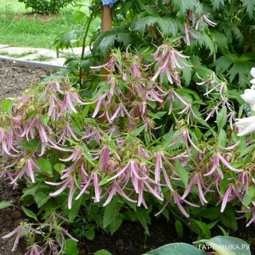 Колокольчик Пинк Октопус такесимский - травянистое растение семейства Колокольчиковые. Высота 45-60 см. Название которого переводится как "розовый осьминог" и дано за необычные цветки. Они розовые с узко-линейными лепестками, крупные на прямостоячих цветоносах. Каждое растение может дать до 50 цветков за сезон. Листья ярко-зеленые, глянцевые, с гравированным краем. Цветение июнь-июль.