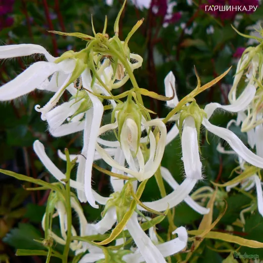 Колокольчик Вайт Октопус такесимский - высота 35-40 см. Листья глянцевые, с зубчатым краем. Цветок белый, крупный, с подкрученными узкими лепестками, похож на осьминога, за что сорт получил свое название. Цветение длительное, обильное. Выглядит необычно и интересно.