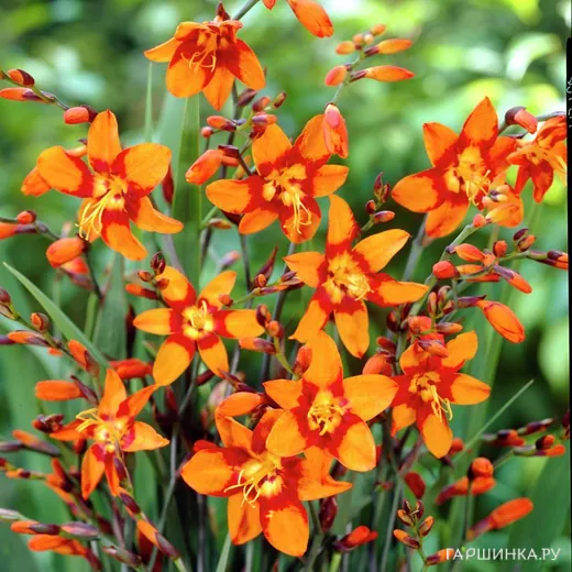Крокосмия (монтбреция) МакКензи 5шт Луковичное растение из семейства ирисовых. Растение до 100 см высотой. Стебель прямой, тонкий, разветвленный. Листья светло-зеленые, широколинейные до 2,5 см шириной, прямостоячие, в густых пучках. Цветки некрупные, 3-5 см в диаметре, воронкообразные, оранжево-красные, собраны в верхушечное, небольшое метельчатое соцветие.