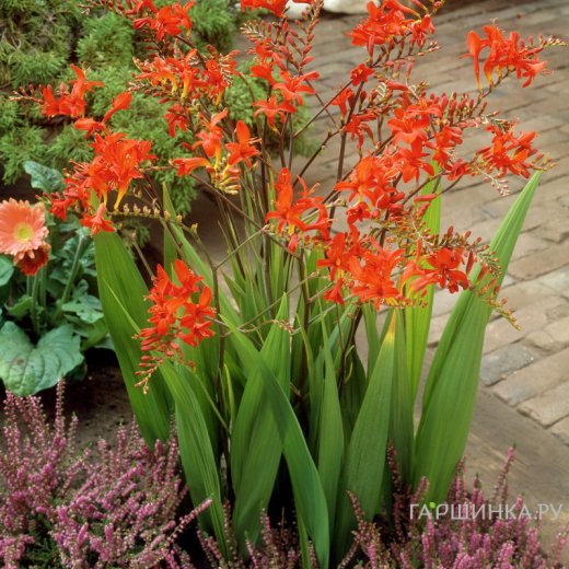 Крокосмия (монтбреция) Люцифер 5шт - самая ярко-окрашенная крокосмия. Высокое (до 1.5 м) растение с прямостоячими цветоносами и яркими, томатно-красными цветками.