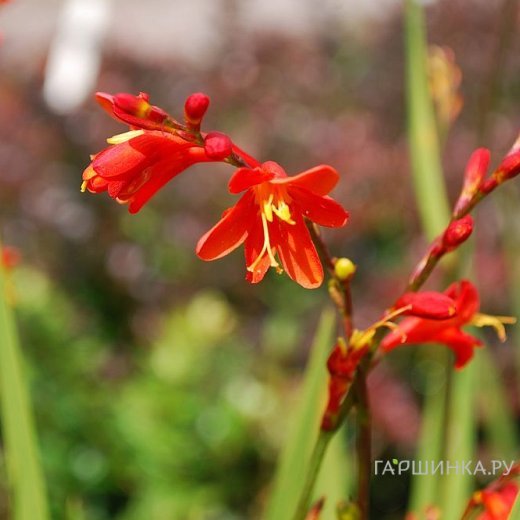 Крокосмия (монтбреция) Ред Кинг - достигает в высоту 80 см. Вытянутые в длину заострённые листья зелёного цвета формируют розетку у основания цветоносов. Цветки среднего и крупного размера (до 10 см) расположены на цветоносе последовательно и распускаются поочерёдно. Цвет красный. Период цветения довольно продолжителен — от начала июля до сентября.