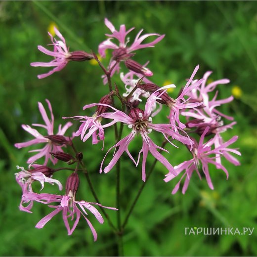 Кукушкин цвет - Растение кукушкин цвет обыкновенный обладает тонкими корнями и высокими, бороздчатыми, редко опушенными, прямостоячими стеблями, вырастающими в длину на 30-90 см. Продолговато-лопатчатые, заостренные на верхушке стеблевые сидячие листья достигают в длину 10 см, а в ширину от 3 до 10 мм и располагаются супротивно. Прикорневые листья черешковые, они крупные и образуют густую розетку. Пятилепестковые цветки растения достигают 3-4 см в поперечнике. Каждый лепесток разделен на 4 длинные доли. Фиолетовые тонкокожистые колокольчатые чашечки кукушкиного цвета обыкновенного достигают 8 мм в длину и имеют до 10 выступающих темно-зеленых жилок. Тычинок у цветка 10, пестики имеют верхнюю завязь. Цветки чаще розовые, с фиолетовым или лиловым оттенком, реже белые, образуют редкоцветковое щитковидно-метельчатое верхушечное соцветие с супротивными веточками. Плод кукушкиного цвета обыкновенного – сухая раскрывающаяся пятистворчатая коробочка, полная мелких (6-10 мм), бугристых, серовато-черных семян.