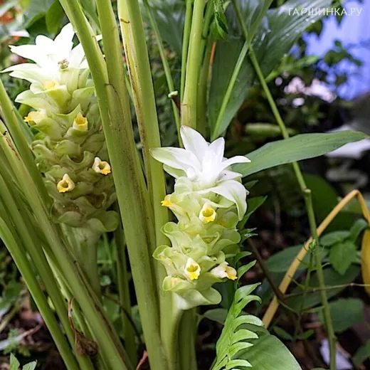 Куркума - Многолетнее ароматическое растение высотой 60-100 см с коротким стеблем и пучковыми листьями. У основания стебля первичный овальный клубень, разветвляющийся, образует множество корневищ с характерным запахом и вкусом, коричневатые и чешуйчатые на поверхности и ярко-оранжевые внутри. Листья однородно-зеленые, пучковые 30-50 см x 7-8 см, лопасти ланцетные, заостренные, бумажные; соцветие - стрелка, 10-15 x 5-7 см, заключенная в листовые узлы; цветки длиной 5 см, белые, тонкие, полупрозрачные; плоды не образуются.