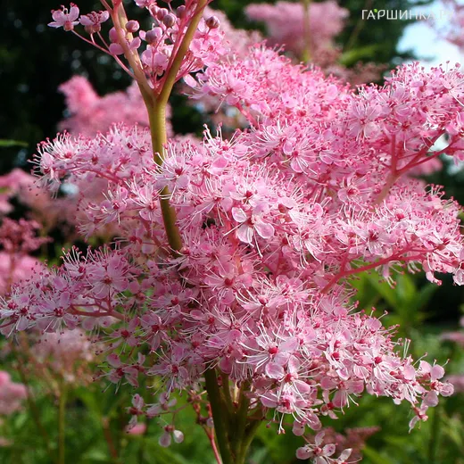 Лабазник (таволга) Венуста - Цветки мелкие темно-розовые. Куст высотой 180 см. Стебли с крупными листьями с пяти- или семилопастной концевой долей. Соцветие густое из мелких темно-розовых цветков. Период цветения июль-сентябрь. Зона зимостойкости: 3 (-40 / -34 °C).