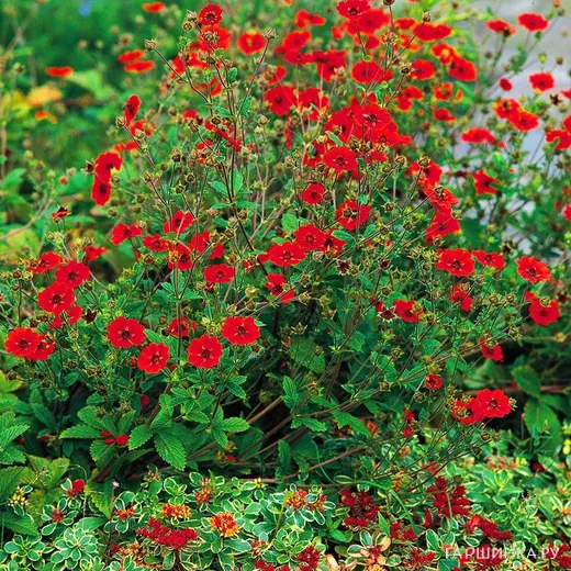 Лапчатка темно-кроваво-красная - кульминация цветения любого альпийского цветника. Так как культура выведена из дикорастущих растений, она очень нетребовательна к уходу и условиям посадки. Высотой до 60 см с прямыми, ветвистыми, опушёнными стеблями. Листва необыкновенно декоративна. Листья тройчатые, пильчатые по краю, с нижней стороны — беловойлочные. Цветки блестяще-красные до 5 см в диаметре, собраны в щитковидные или метельчатые соцветия.