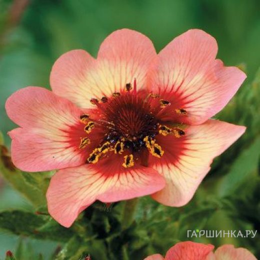 Лапчатка травянистая Твинклин Стар - восхитительный сорт лапчатки гибридной. Высота взрослого растения от 30 до 45 см, ширина: до 60 см. Листья тройчатые (каждая доля - овальная), зелёные, с нижней стороны - немного опушённые. Края листьев - зубчатые и сильно перистые с кремово-розовыми цветками с ярко-красным пятном.