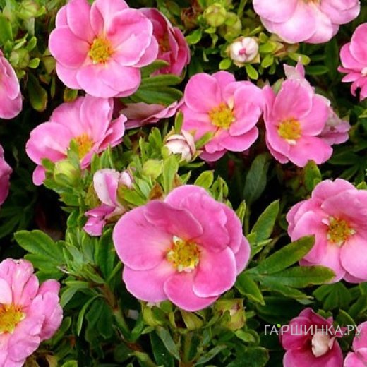 Лапчатка кустарниковая Пинк Парадайз - красивоцветущий, ветвящийся куст, высотой до 60-80 см. Диаметр кроны до 100 см. Листья сложные, характерные для лапчаток, светло-зеленые - весной, зеленые с серебристым оттенком - летом, немного опушенные. Цветки некрупные, до 3 см. в диаметре, полумахровые, насыщенно-розового цвета, серединка ярко-желтая. Цветение в июне-октябре. Предпочитает солнечные места или легкую полутень. Лапчатка Pink Paradise (Пинк Парадайс) морозоустойчива.