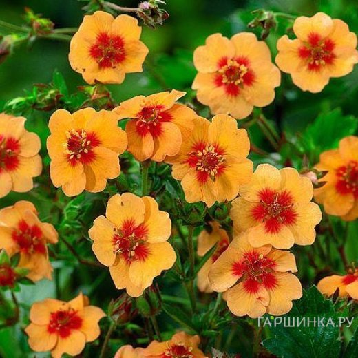 Лапчатка травянистая Тонги - восхитительный сорт лапчатки гибридной. Высота взрослого растения от 30 до 45 см, ширина: до 60 см. Листья тройчатые (каждая доля - овальная), зелёные, с нижней стороны - немного опушённые. Края листьев - зубчатые и сильно перистые. Лепестки цветков персиковые с темным пятном в середине.