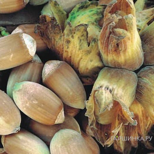 Лещина обыкновенная (фундук) Вебба Ценный - Высокоурожайный при условии наличия другого сорта. Куст высотой до 5 м, растёт быстро. Крона компактная, широкая, плотная. Листья большие, тёмно-зелёные, осенью – с жёлтыми и коричневатыми оттенками. Серёжки жёлтые. Цветёт до распускания листьев. Орехи крупные, удлинённые, созревают в конце сентября. Скорлупа средней толщины. Ядро очень вкусное, сладковатое, почти полностью заполняет скорлупу. Место солнечное. Почва плодородная, умеренно влажная, дренированная.