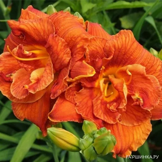 Лилейник Даблишес– травянистый корневищный многолетник. Высота достигает 65 см. Цветки махровые диаметром 14 см с рифлеными лепестками сочных апельсиновых оттенков и нежной позолотой насквозь пронизаны красными жилками. Повторноцветущий.