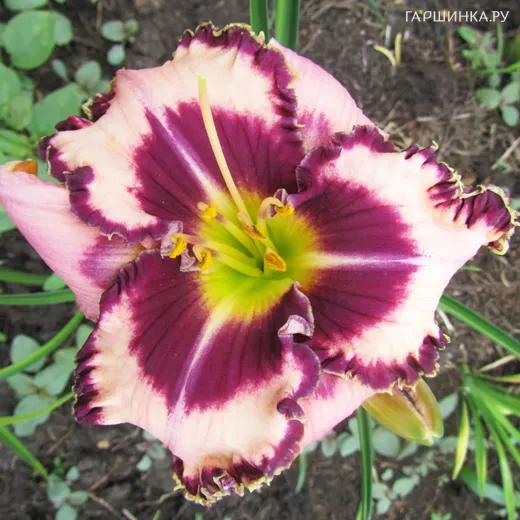 Лилейник Пурпл Флэйм– травянистый корневищный многолетник. Высота 60 см. Цветки 15 см диаметром, кремово-розовые, с крупным фиолетовым глазком и двухцветной гофрированной каймой, горло жёлто-зелёное. Вечнозелёный, диплоид, без аромата. Цветение июнь-июль.