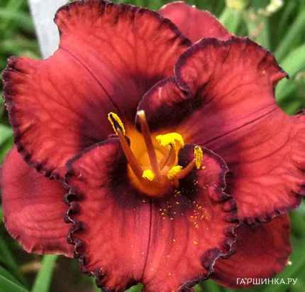 Лилейник Беррилишис– травянистый корневищный многолетник. Высота растения: 60 см. Диаметр цветка: 15 см. Винно-красного цвета с фиолетовым горлышком и темно-фиолетовой окантовкой лепестков. Листья узкие, мечевидные.