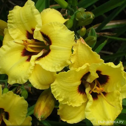 Лилейник Бамбл Би– травянистый корневищный многолетник. Высота до 40 см, диаметр цветка 10 см. Цветы гофрированные, лимонно-желтые с коричневым глазом и желто-зеленым горлом. Вечнозеленый, диплоид, повторноцветущий, тип цветения дневной.