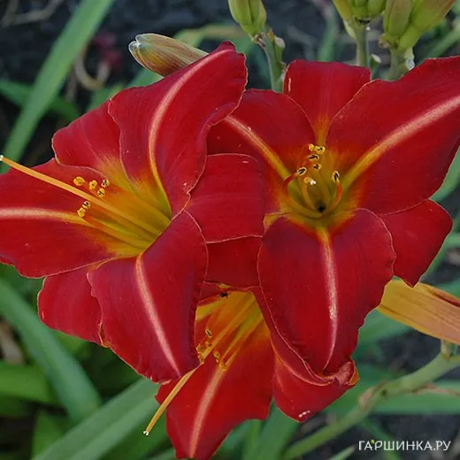 Лилейник Чикаго Файр– травянистый корневищный многолетник. Высота 75-85 см, диаметр цветка 15 см. Довольно большой, яркий, красно-алый лилейник со срединной светлой полосой и затемненным глазом. Полувечнозеленый, тетраплоид. Обильное, продолжительное цветение в начале августа.