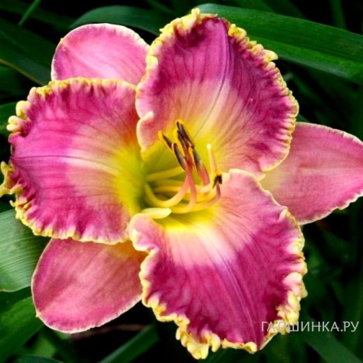 Лилейник Дэвид Киргхоф– травянистый корневищный многолетник. Высота растения - 65 см; диаметр цветка - 14 см. Малиново-лиловый с гофрированной желтой каймой на внутренних лепестках. Светлозеленое горло. Цветение в середина августа; повторное.